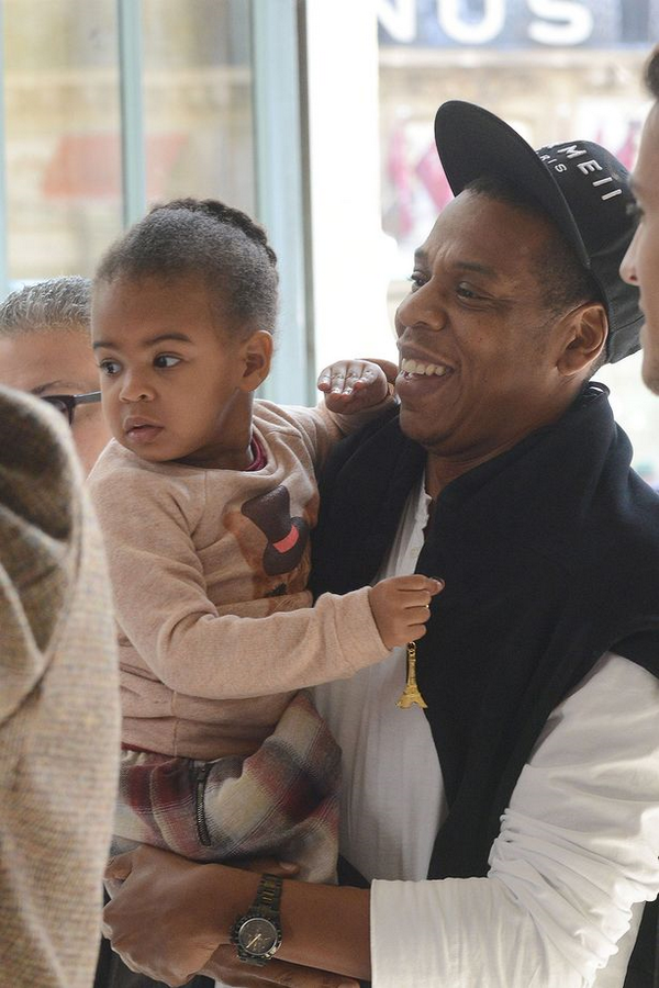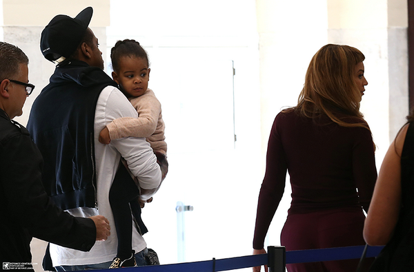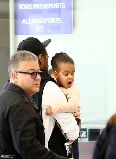 The Carters were spotted arriving at the Gare du Nord train station in Paris today. Although Bey's bangs are beyond noticeable I think Blue Ivy is the real star of these photos looking just like her Dad in his arms with her hair pulled back in an updo.